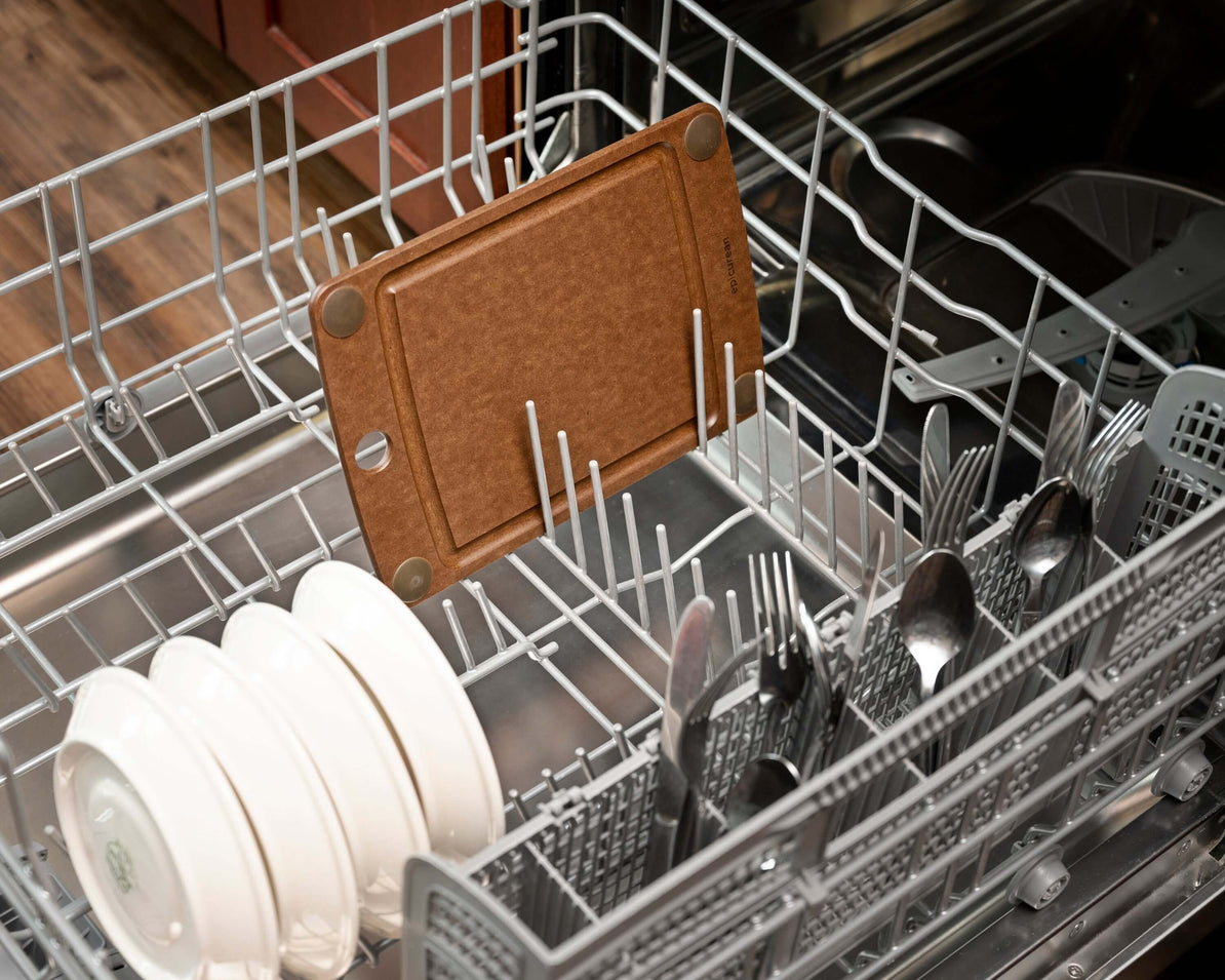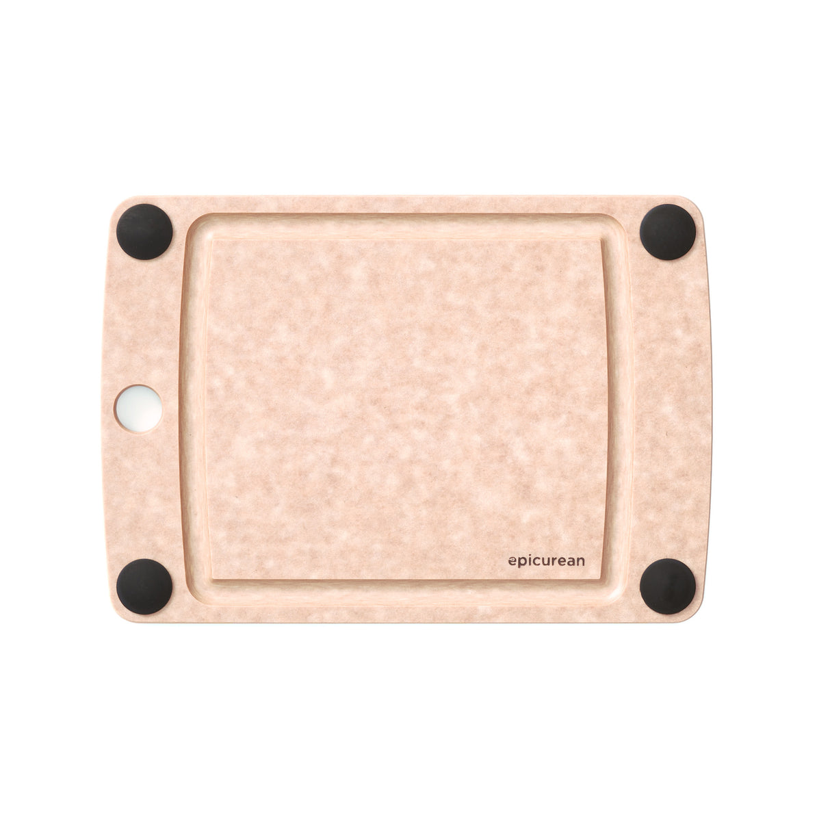 The best features of our most popular boards were combined into the Epicurean All-in-One Cutting Board Series. Utilize both sides of the board - use the juice groove side to catch excess liquids, or flip the board over if you need even more space. The four non-slip silicone feet keep the board secure either way. These thin and lightweight boards are available in five sizes and three colors. Made in USA of U.S. and Imported Parts
